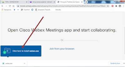 Για να συνδεθείτε σε τηλεδιάσκεψη WebEX πρέπει να γράψετε στον φυλλομετρητή σας (browser) τη δικτυακή διεύθυνση (url) της ηλεκτρονικής αίθουσας τηλεκπαίδευσης που σας έχει αποστείλει η εκπαιδευτικός. Αυτή θα είναι της μορφής: https://minedu-primary2.webex.com/meet/…. .