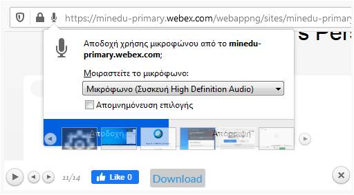 Τα βασικά εργαλεία της πλατφόρμας Webex (μικρόφωνο, κάμερα, chat) φαίνονται παραπάνω. Για να συνδεθείτε στο δωμάτιο θα χρειαστεί να κάνετε αποδοχή της χρήσης του μικροφώνου και της κάμεράς σας