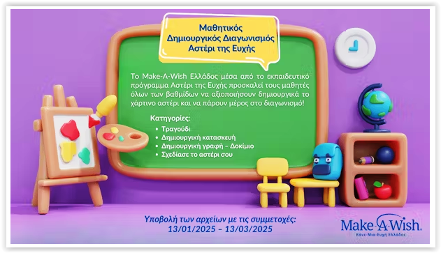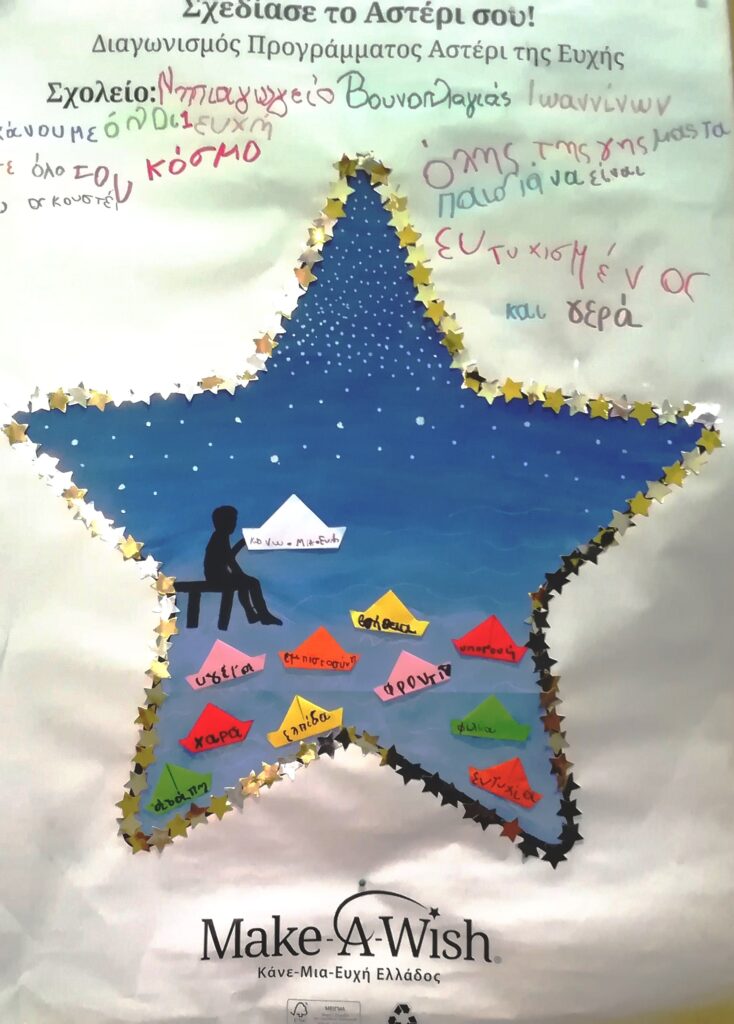 Το Make-A-Wish (Κάνε-Μια-Ευχή Ελλάδος) https://makeawish.gr/ είναι ένας Φιλανθρωπικός, μη Κερδοσκοπικός Οργανισμός που πραγματοποιεί, μέσω δωρεών, ευχές παιδιών ηλικίας 3-18 ετών, που πάσχουν από απειλητικές για τη ζωή τους ασθένειες ενισχύοντας τον αγώνα τους για ζωή με Χαρά, Δύναμη και Ελπίδα. Όπως κάθε χρόνο έτσι και φέτος συμμετείχαμε στον Δημιουργικό διαγωνισμό σχεδιάζοντας το δικό μας Αστέρι…